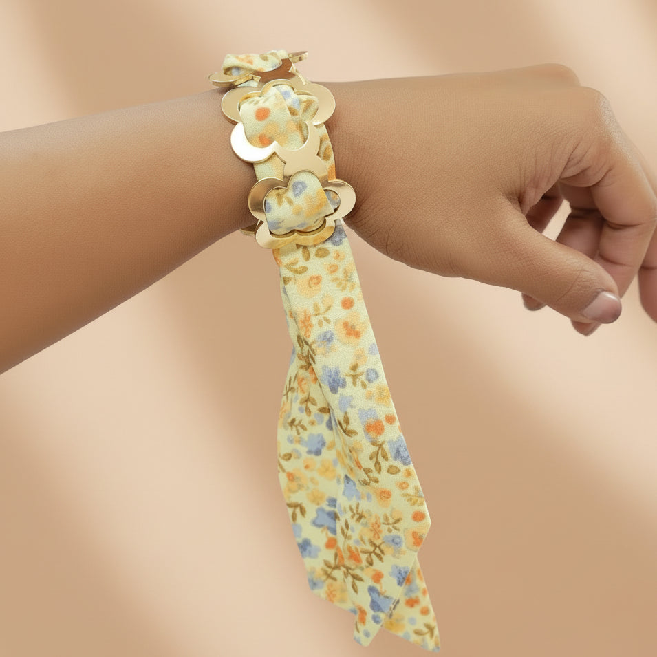Add a soft, feminine touch to your look with this elegant floral scarf chain bracelet. Featuring polished gold-toned links paired with a delicate printed fabric tie, it blends modern style with graceful charm.